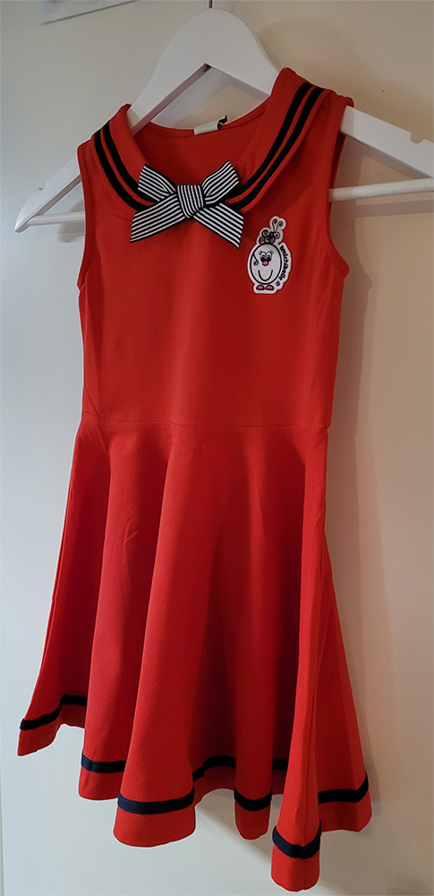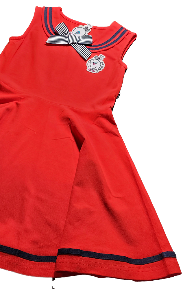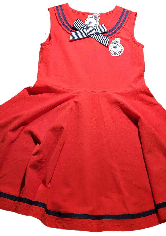Nydelig myk rød sailor-kjole med kort arm, 95 % bomull og 5 % spandex (stretch). Nydelig med hvit bluse på vinteren og uten på sommeren! Finnes også i marineblå.